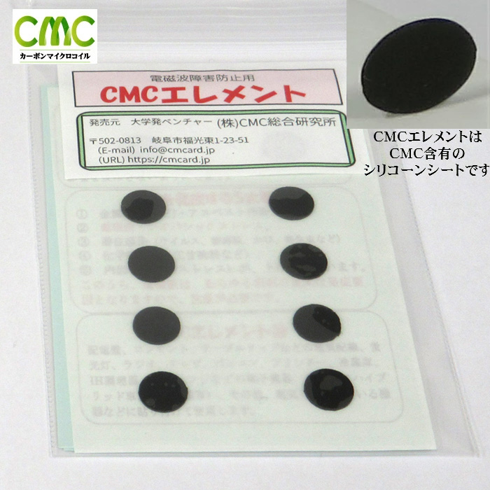 CMCエレメントA(単層) シリコーン樹脂にCMC粉末を混練・成形・配置したシート 仕様 CMC充填量:約5mg/枚 一枚の大きさ:直径9.5mm 厚さ0.5mm 10枚セット よくあるご質問 使い方について 家庭用電気機器に貼り付けて使用します。(シート裏面に粘着剤付) CMCの充填量について CMC量は多ければ多いほど、範囲、地磁気の上昇やテロメア値の上昇など健康へのストレスが軽減します。充填量が2倍になると効果も2倍となります。最適なCMC量は、お客様のおかれる環境によって防御範囲は変化しますので一概には申し上げることはできませんが、例えば太陽光パネル、高圧変電所・高圧送電線、携帯電話の中継アンテナ(5G)など電磁波発生源がご自宅の近くにありますと、電磁波環境が厳しいということになります。 使い方の具体例 利用頻度の高いものから優先的に貼っていただくことをおすすめします。貼る場所は、どこでも構いません。目立たないように商品の背面や下部などでも問題ありません。 ■オススメのご使用例(エレメントA〔単層〕基準)スマホ、タブレット:1-2枚ノートパソコン:キーボードの四隅に各1枚ブレーカー:各ブレーカーに1枚テレビ:小さいものは、四隅に各1枚。大きいものは四隅及び各辺の中間に1枚。スマートメーター:3枚電子レンジ:8枚ドライヤー:1枚IHコンロ:10cm間隔冷蔵庫:全面四隅に各1枚。側面に(手前の方に)各2枚(計16-20枚程度)洗濯機:全面の下の方(モーター付近)に4枚。上のパネル近くに2枚(計10-12枚程度)LED:1枚 エレメントC(三層)タイプとの使い分けですが、エレメントA(単層)の枚数の半分で済むと捉えていただければと思います。 有効期限は? CMCの効果は半永久的に保持いたします。 粘着剤が剥がれてしまいました。 粘着剤が劣化してつかなくなった場合は、市販の両面テープ等で代用ください。 欠品・在庫切れの場合 ネットで購入できるCMC製品は『楽天(CMC総合研究所直営)』か、正規代理店が運営するネットショップで販売しております。『楽天』に商品在庫がない場合でも代理店のショップでお取り扱いがある場合もございます。 正規代理店が運営するネットショップについてはこちら 電磁波は何%カットされますか? CMC製品は人口電磁波によるお身体へのダメージからお守りするものでございます。CMCを用いた電磁波対策というのは、一般的に言われるようなカットや反射というアプローチではなく、人工的な電磁波に付加されているノイズ(規則的波形に混じる歪みのようなもの)を変調するように取り除くことで無害化するというものになります。CMCを使った電磁波対策では電磁波をカットすることはありません(カットしてしまうと多くの電子機器が使用不能になります)。 ご購入はこちら 楽天で購入 Yahoo!ショッピングで購入 現在のリンク先: Yahoo!ショッピング正規代理店一覧はこちら Amazonで購入 現在のリンク先: Amazon正規代理店一覧はこちら このカテゴリーの他の製品 CMCエレメントC(三層) CMCエレメント 一覧に戻る トップページへ戻る